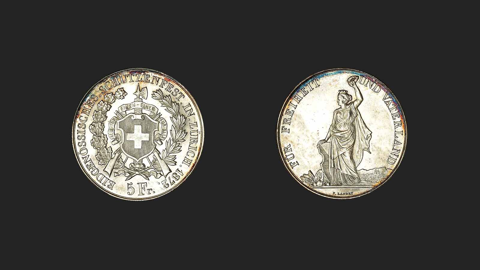 Anlässlich der Eidgenössischen Schützenfeste wurden stets Medaillen geprägt. Zwischen 1855 und 1885 entsprachen diese in Durchmesser, Legierung und Gewicht exakt den zirkulierenden Fünffrankenstücken. Sie waren nicht nur als Erinnerungsstücke gedacht, sondern auch als Zahlungsmittel während des Schützenfestes. Weil sie defacto den Wert von fünf Franken auch nach dem Fest beibehielten, gelangten sie auch in den allgemeinen Zahlungsverkehr.
