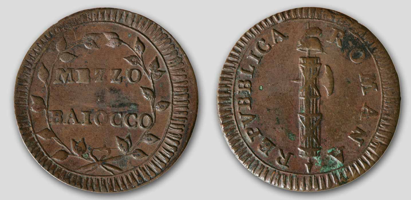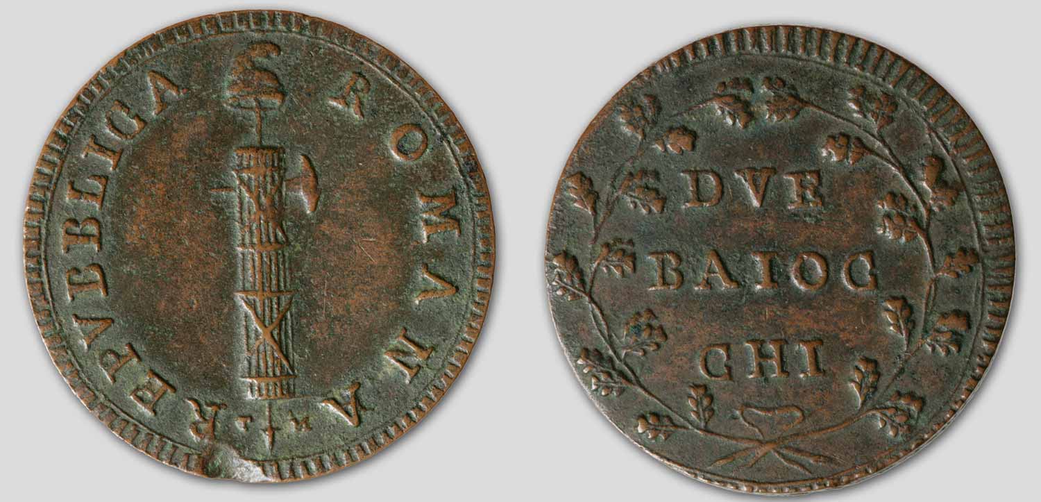 Immerhin war der Papst zu der Zeit wohl auf der Flucht, und neben Rom und Bologna haben viele weitere Münzstätten Kupfermünzen mit "Republica Romana" geprägt.