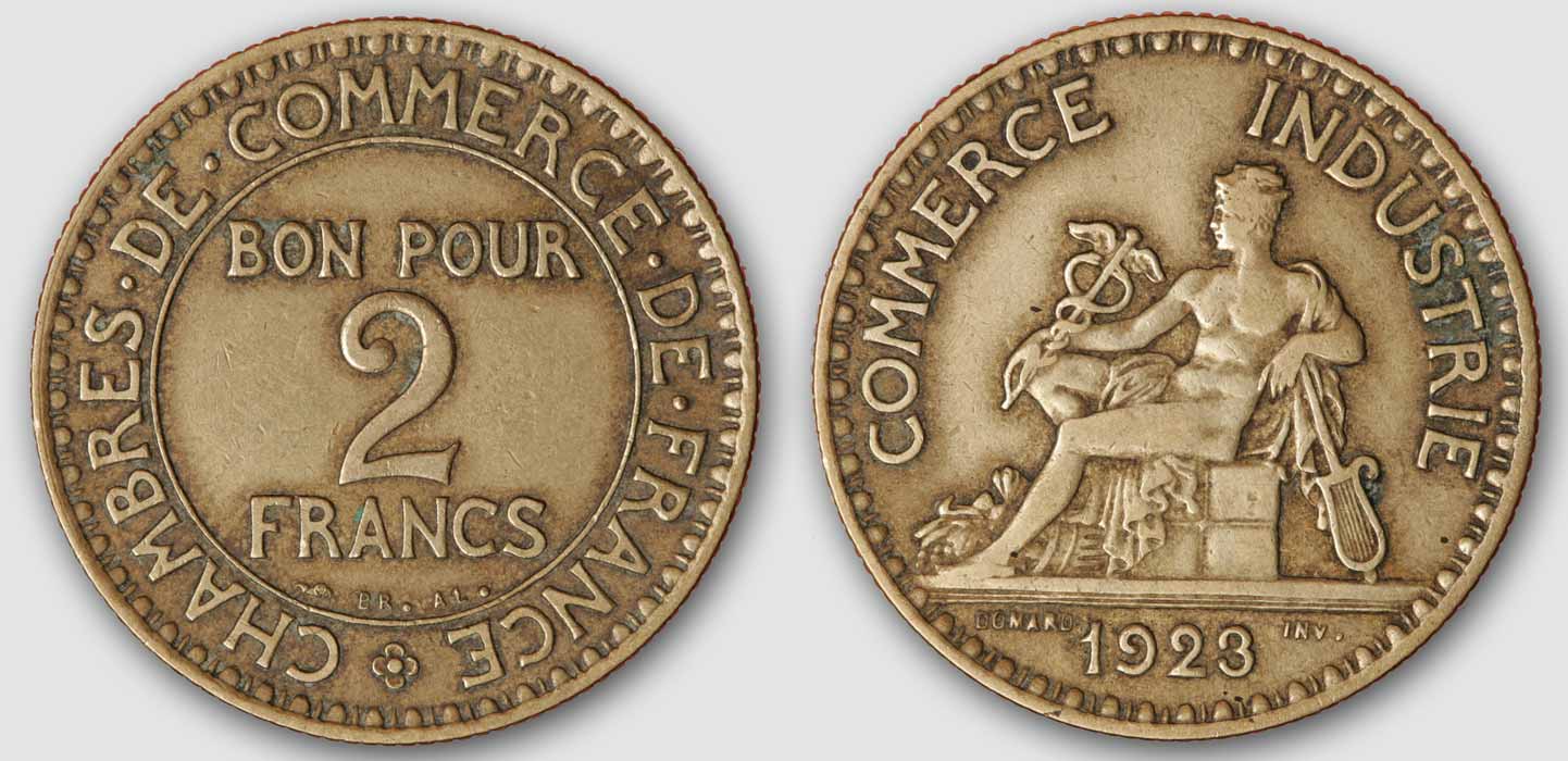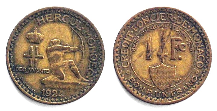 Monaco, 1 Franc 1924, Av. Bogenschütze neben bekröntem Spiegelmonogram von Louis II. (1922-1949), darunter Devise DEO IVVANTE (Mit Gottes Hilfe), Umschrift HERCUL MONOEC / Rv. Wert 1 Fc. geteilt durch Schwert über Staatswappen, Umschrift im Innenkreis REMB(oursable) AU 31 X-BRE 1926 (einlösbar bis zum 31. Okt. 1926), Umschrift im Außenkreis CREDIT FONCIER DE MONACO (Ausgabe der Bodenkreditbank von Monaco) - BON P(our) UN FRANC (Graveur: Lindauer), Gadoury#111, S#3.