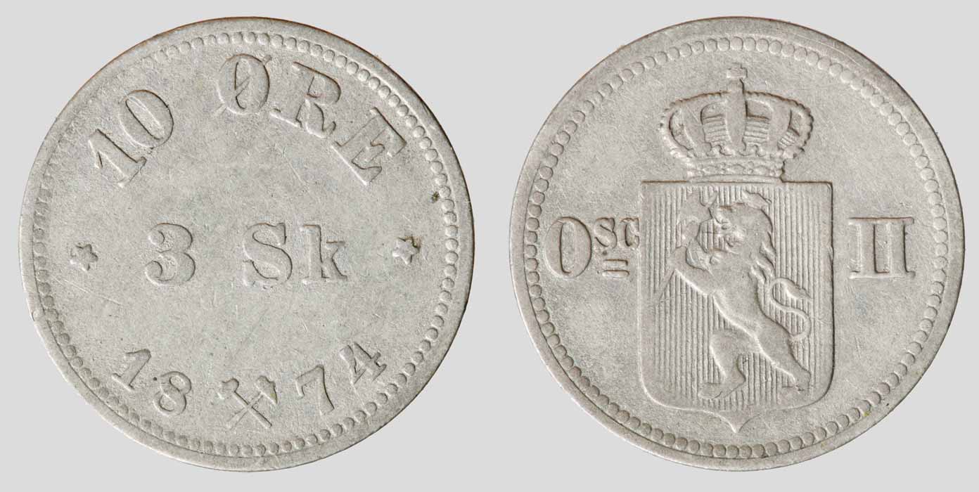 10 Ore = 3 Skilling, 1874, S#, KM#345, Mst. Kongsberg (erkennbar an Schlägel und Eisen)