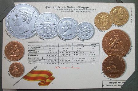 For many decades the signature denomination of the Spanish coinage series was the peseta, which began in 1869 as the coin of .835 fine silver and 5-gram weight familiar to collectors acquainted with the Latin Monetary Union, and ended as a tiny piece of aluminum in 2001.