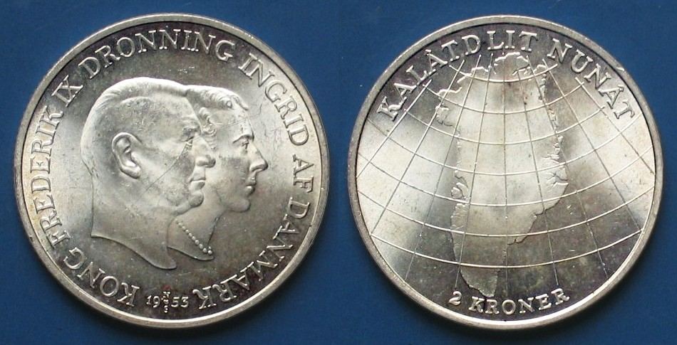 Eine nette Arbeit, klaupo. Ich stimme Ihnen über die 1953-Dänisch 2-Kroner. Es wurde in der Tat zu einer Prämie zugunsten verkauft der der König und Queen's Foundation organisiert zur Bekämpfung der Tuberkulose in Grönland, aber seine ultimative Zweck scheint zu sein, um die Einbeziehung Juni ' 53 Grönlands markieren in Dänemark.