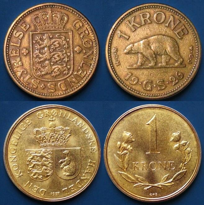 Die grönländische Krone stand in Währungsparität 1 : 1 zur dänischen Krone, die auf Grönland ebenfalls in Umlauf war. Als am 1. Juli 1967 die letzten grönländischen Münzen eingezogen und durch dänische Münzen ersetzt wurden, ging diese Umstellung daher reibungslos vonstatten.
