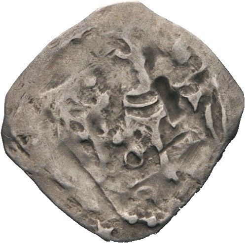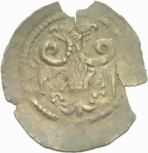 Dieser Pfennig stammt aus der Reichsstadt Nürnberg (Erlanger 86) und gleicht im Motiv den österreichischen Pfennigen der Periode.
