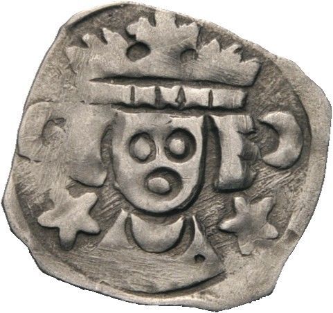 Der 2. Pfennig, der vom gleichen Anbieter eingestellt wurde, ist der von mir auch schon vorgestellte B176, der natürlich wirklich Ottokar zuzuschreiben ist; vermutlich ziemlich spät (1275). Sie zeigt auf der Rückseite den Wappenschild des Stadtschreibers Konrad von Tulln, der in Urkunden als Vasall Ottokars aufscheint und später auf die Seite Rudolfs gewechselt ist. Ottokar verhalf auch dem Grazer und Oberzeiringer Münzwesen zu großer Blüte. Die von im dort geschlagenen Pfennige zeigen oft sein Bild und seinen Namen (D13) oder auch Hinweise auf die Münzstätte (MUNE GRETZ, MOH(N)ETH STIRIE, SCHILT VON STEIER).