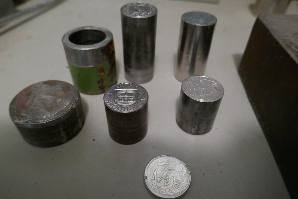 Ich habe Prägeversuche mit Schrötlingen aus Aluminiumblech gemacht und füge hier einige Bilder an, die meine Vermutungen bestätigen. Ein befreundeter Graveur hat mir einige Stempel gefertigt, die ich zur Münzprägung für meine Pfadindergruppe (Lagergeld) verwendet habe. Als Münzmetall verwendete ich damals Zinn. Diese Equipment habe ich hier für meine Veruche verwendet.