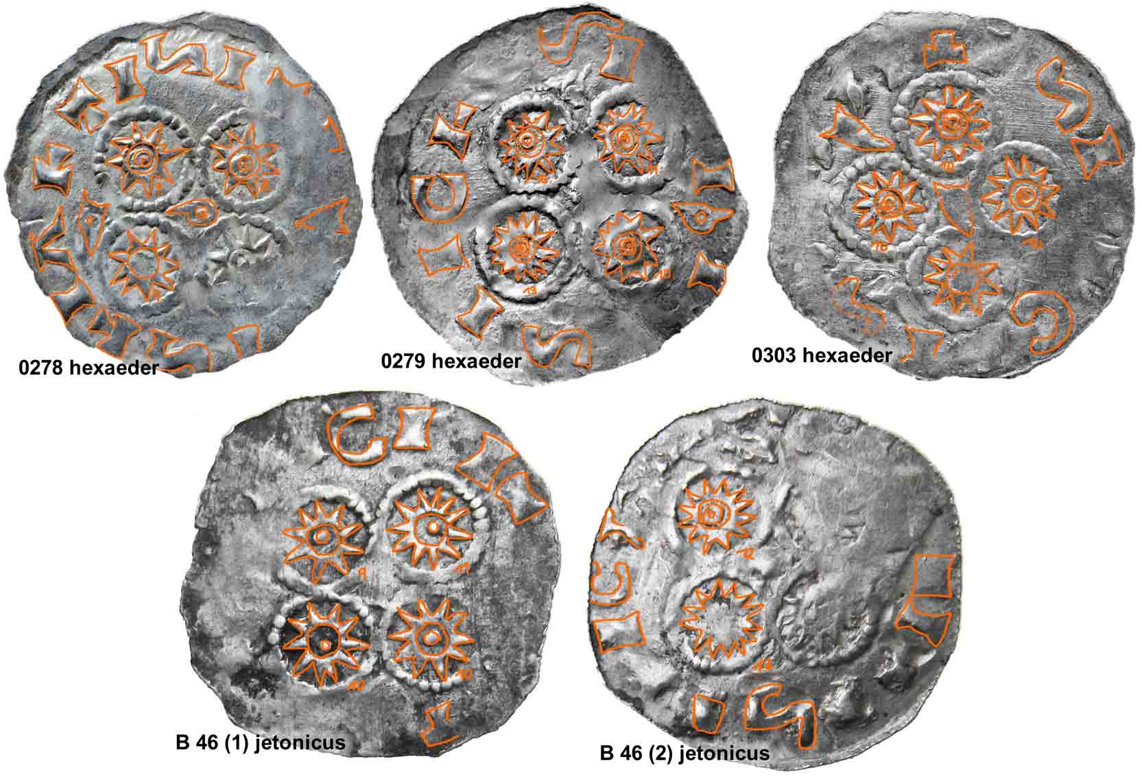 Bis auf den Beleg 0278 hexaeder links oben, zeigen die vier übrigen B 46 Averse auf dem Foto deutliche große "C" in der Trugschrift. Weitere erkennbare Buchstaben wären breite, stehende und liegende "I", stehende und liegende "T" und auf der Münze links oben (statt dem "C"?) ein gotisches "A".