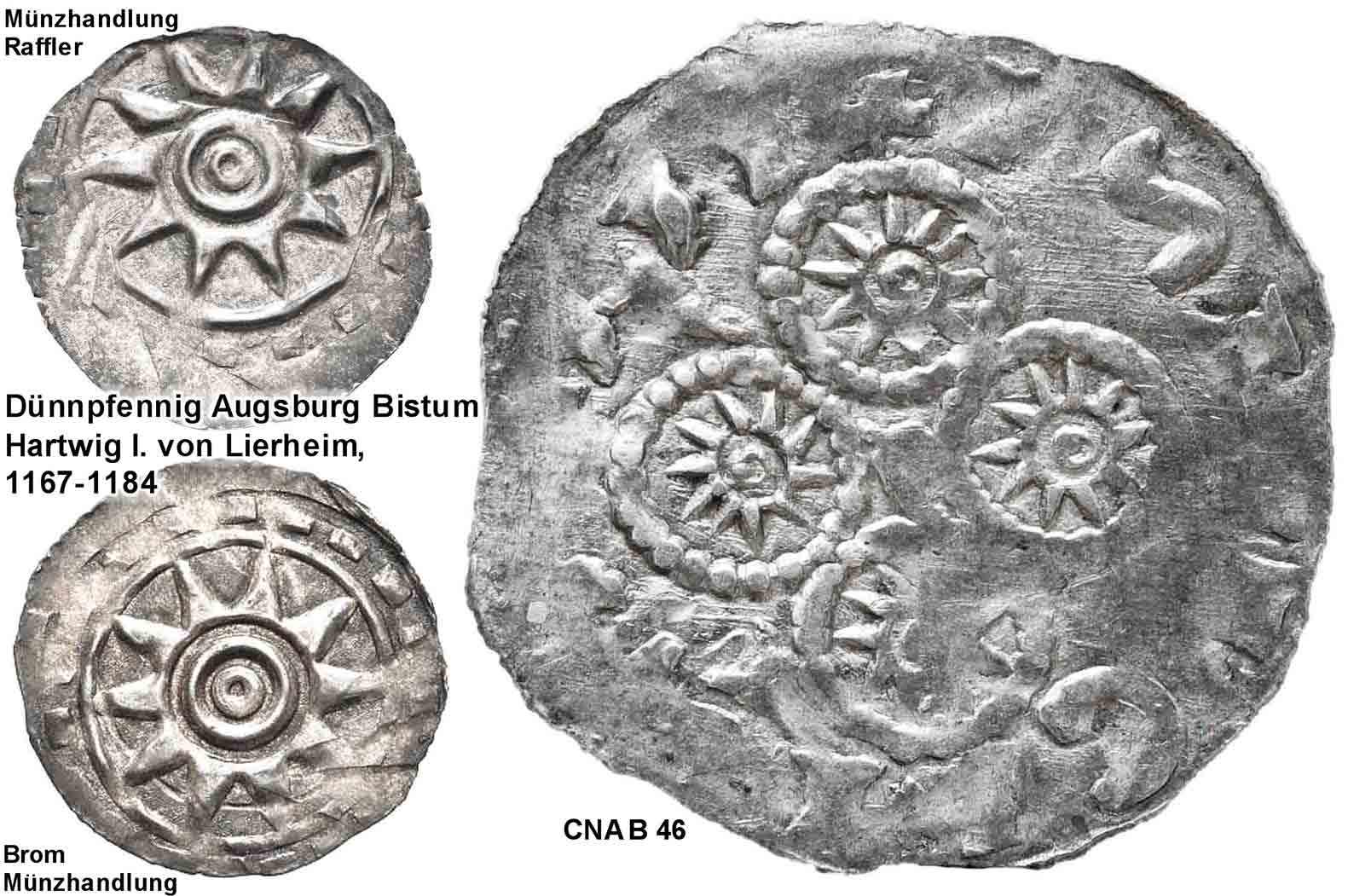 Nicht nur der Kentaur oder Herkules in Kampf mit dem nemeischen Löwen ist ein Motiv, dass sich sowohl auf Neunkirchner Pfennigen des 12. Jahrhundert´s findet als auch auf Geprägen aus Bayern, sondern auch jene sternförmig nach außen gezackten Kreise finden sich in Augsburg wieder. Das zentrale Motiv des Dünnpfennigs von Hartwig I. von Lierheim, Bistum Augsburg, zeigt verblüffende Ähnlichkeit mit dem Motiv der Neunkirchner Pfennige B 46 und auch des (hier noch nicht vorgestellten) B 47. Lediglich die Größe unterscheidet das Stempelbild. Während bei den Kentauren- und Herkules-Typen das Motiv (oder die Punze) eher von Bayern (Regensburg/Emmerig 60) nach Neunkirchen gewandert sein dürfte, könnte es in diesem Fall umgekehrt sein?