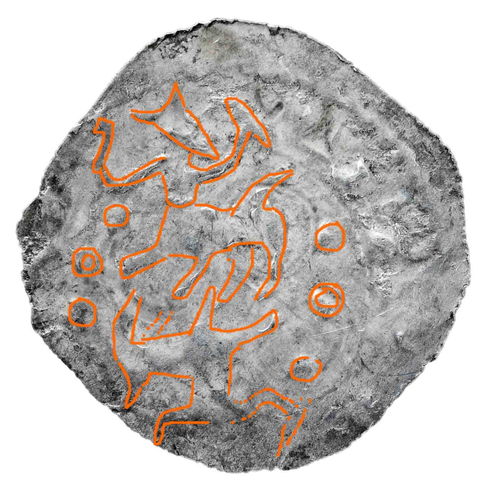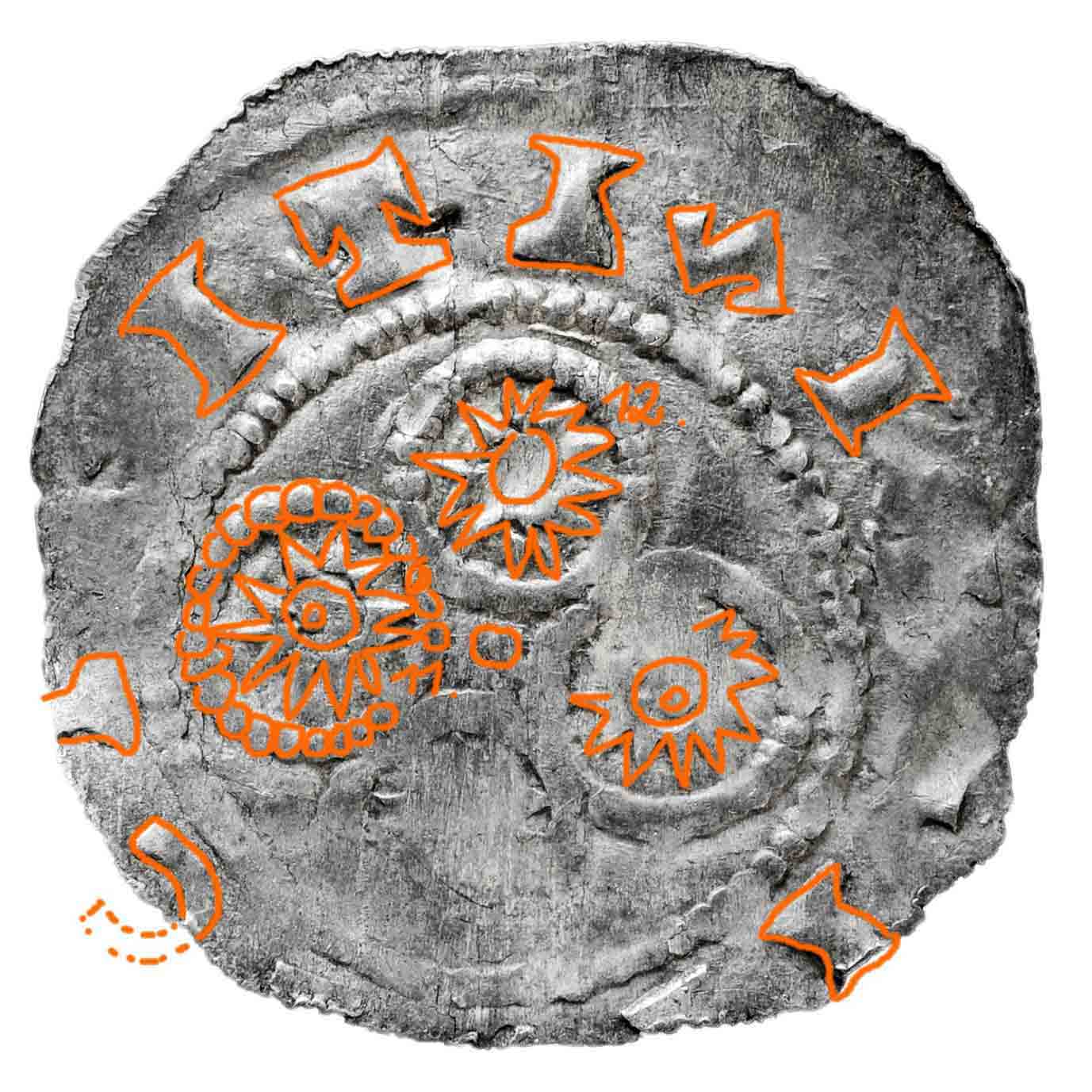 Zusätzlich zu jenen vier ins Kreuz gestellten kleinen Perlkreisen findet sich in jedem Kreuzwinkeln je ein Ringel-Beizeichen und im Zentrum zwei Punkte.