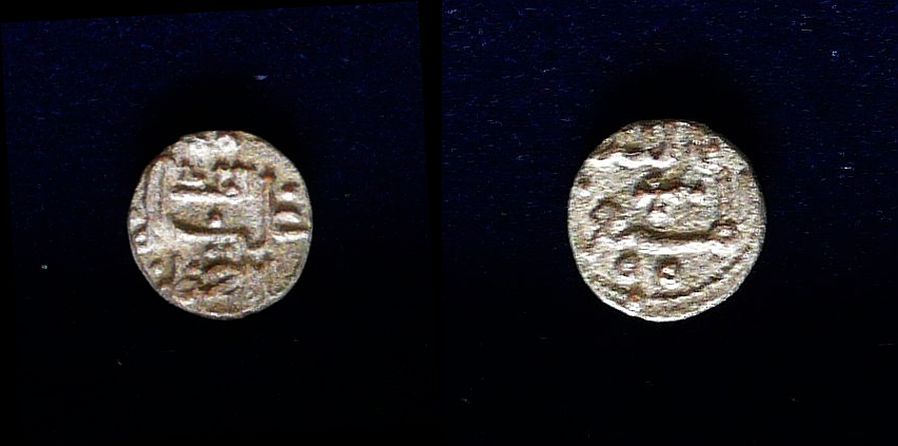 Nachstehendes Foto zeigt eine winzige Silbermünze, die als "Teil eines Dirhems" bezeichnet wird. Das Gewicht liegt zwischen 0,7 und 0,9g, und der Durchmesser zwischen 9 und 10 mm [Spahr 116].