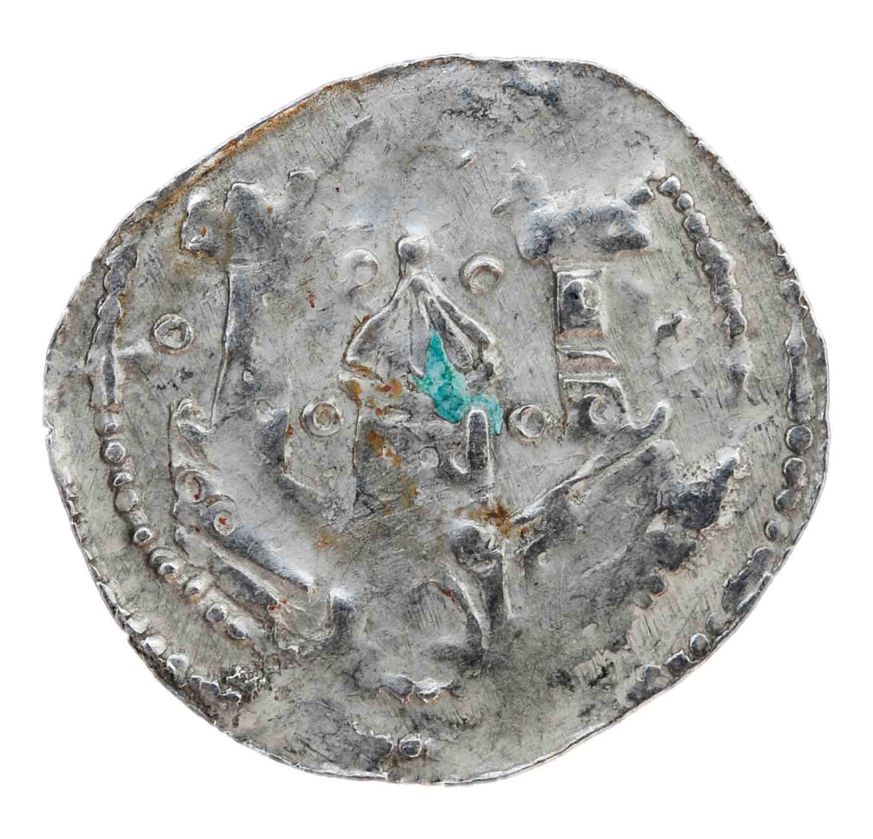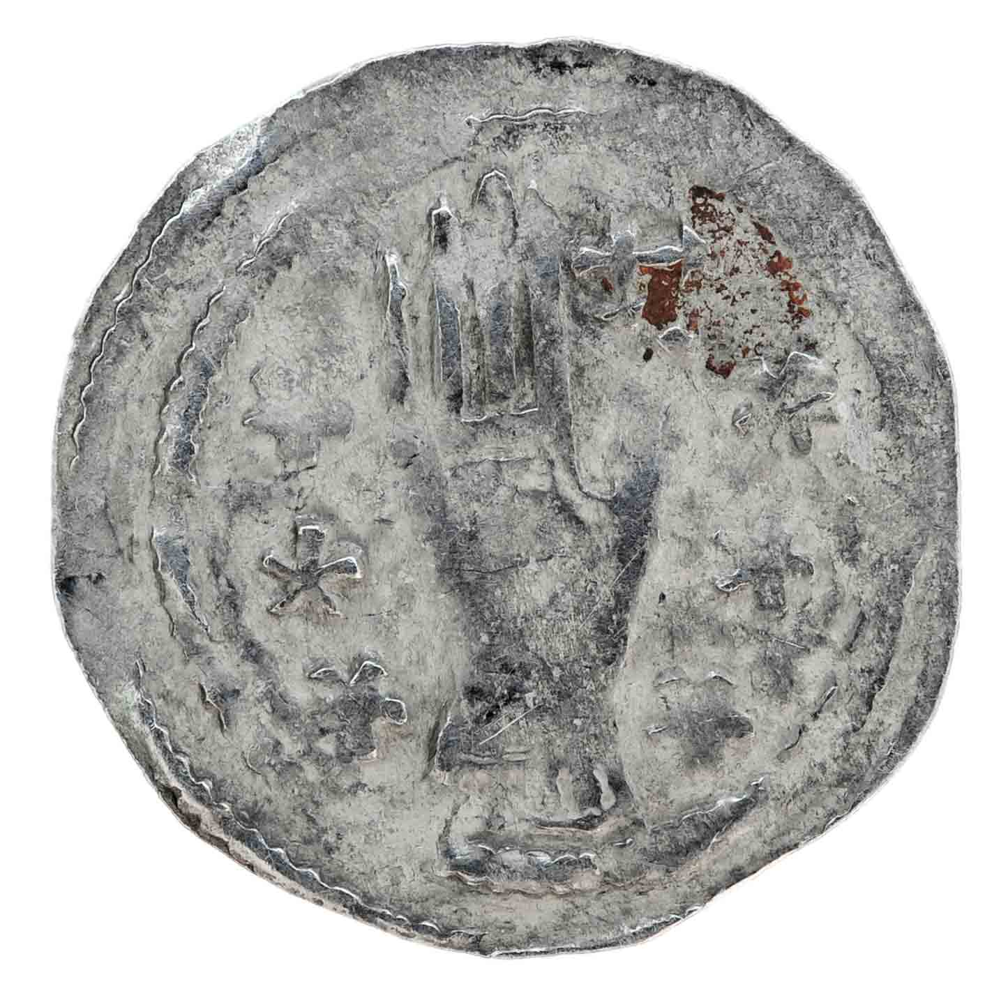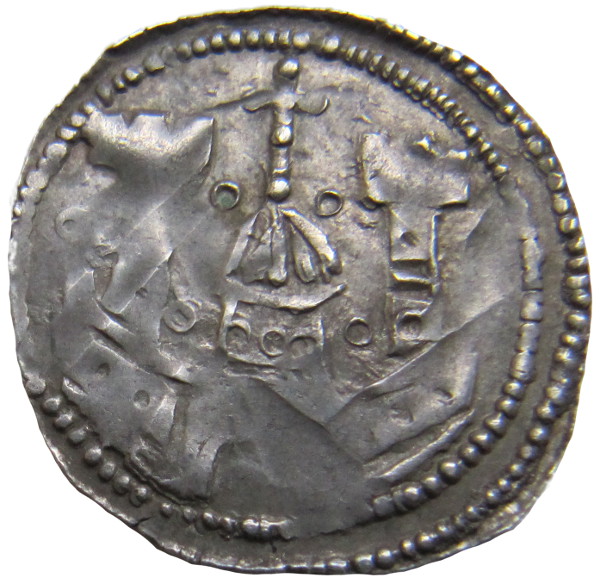 Auf der anderen Münzseite ein dreiteiliges Gebäude mit 3 Kreuzen auf den Dachspitzen. Darunter ein Torbogen/Brücke mit Punkten. Beidseitig diverse Beizeichen, wie Ringel oder Sterne.