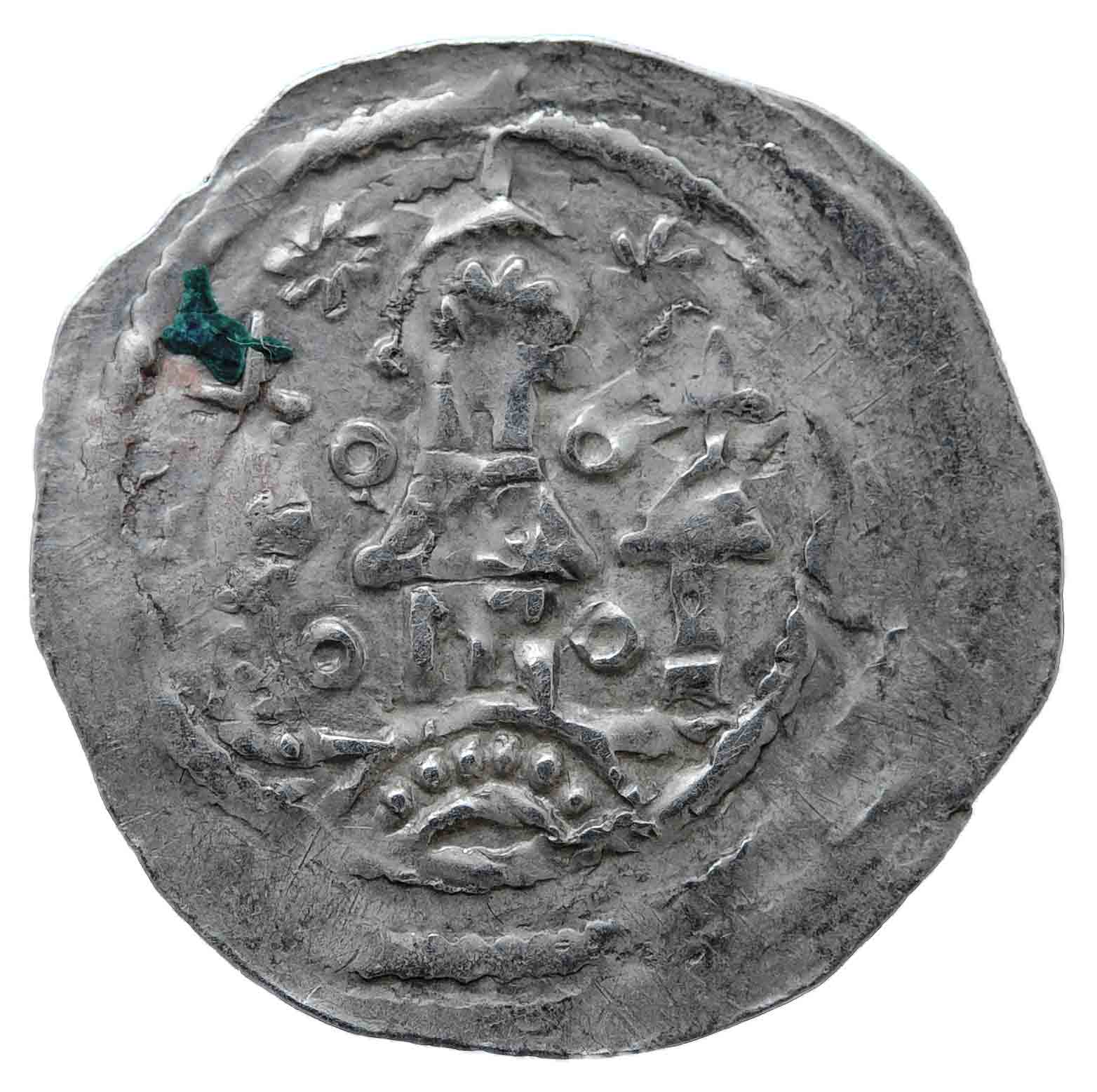 Jene nun besprochene Münze weist beidseitig eine recht deutliche Prägung auf. Die Gebäudeseite trägt oben links und rechts des mittleren Turms achtzackige Sterne/Rosetten. Mittig und unten befinden sich bei diesem Stück, wie beim zweiten vorgestellten Pfennig dieser Art, keine weiteren Beizeichen mehr.