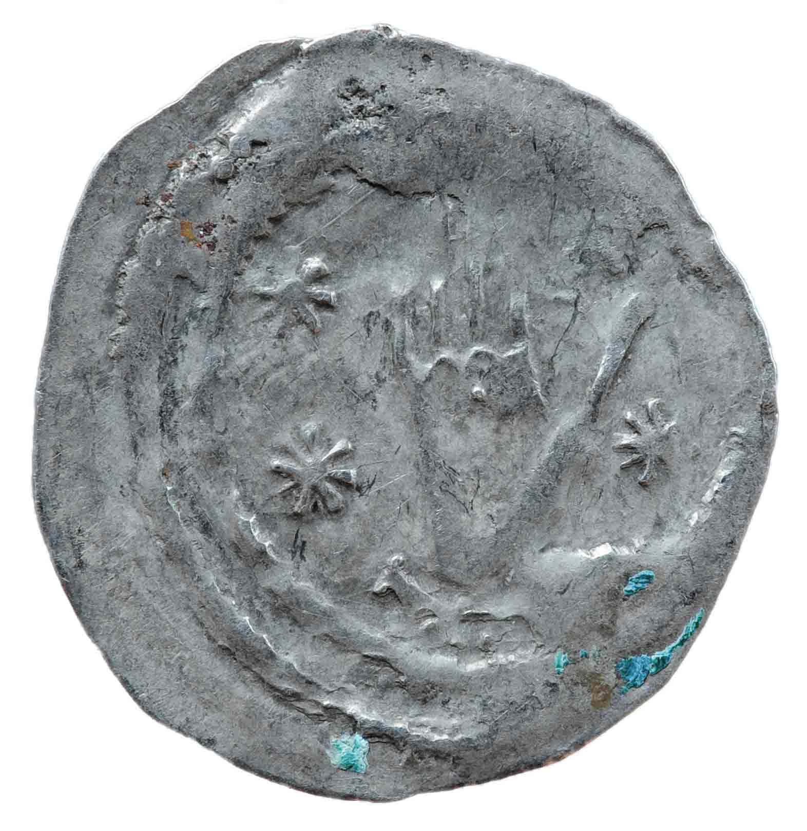 Auf der Münzseite mit der Hand Gottes sind drei achtzackige sternförmige Beizeichen erkennbar. Zwei links der Hand und eines unter dem Daumen. Möglicher Weise befindet sich auch eines oberhalb des Daumens? Das kann aber aufgrund einer Prägeschwäche in diesem Bereich, nicht mit Sicherheit behauptet werden. Die Hand zeigt diesmal einen verhältnismäßig langen Daumen und einen geschwungenen Fingeransatz mit darunter liegendem Punkt.