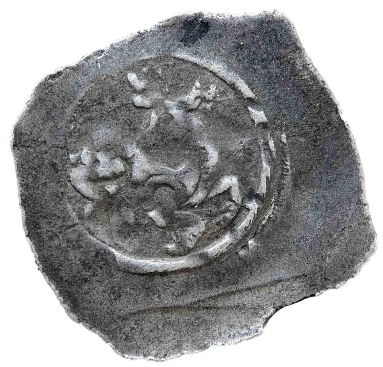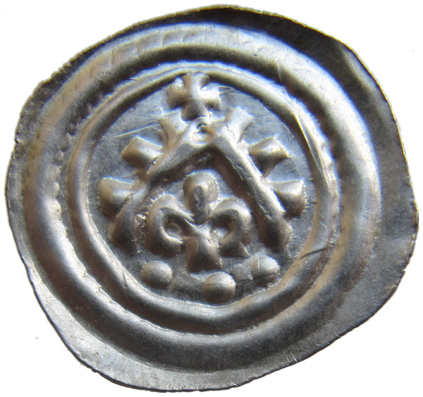 Zum Ce5 hätte ich da noch eine Frage. Laut der Beschreibung von Koch, hätte der Ce5 mit den 3 Punkten oberhalb des mit Zinnen besetzten Sparren noch KEIN Kreuz. Erst bei der Version Ce5A (mit zwei Punkten) wird auf das Kreuz hingewiesen! Dein Brakteat hat aber eindeutig 3 Punkte unter der Lilie und ein Kreuz über den Sparren.