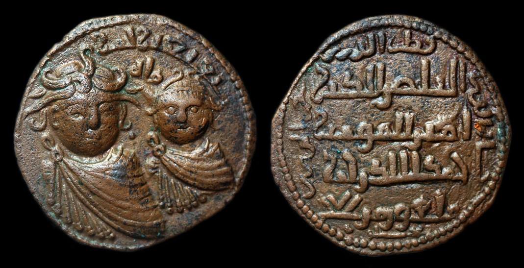 Artuqiden von Mardin, Qutb al-Din il-Ghazi II, AH 572-580/AD 1176-1184. AE Dirhem AH 578 (AD 1182/3). Av. Zwei Büsten in byzantinischem Stil, diademiert und drapiert, frontal, darüber das Prägejahr 578. Rv.Legende in fünf Zeilen: al-Násir li'l-din / Amir al-mu'minin / hadha al-dirham / (Tamgha) ma'lunman / yu'ayyaruhu. Randschrift Name und Herkunft des Münzherrn: Links: Naim al-Din bin / Oben: Qutb al-Din bin / Rechts: Husam al-Din.14,53 g, 32 mm. Spengler/Sayles 32.2.