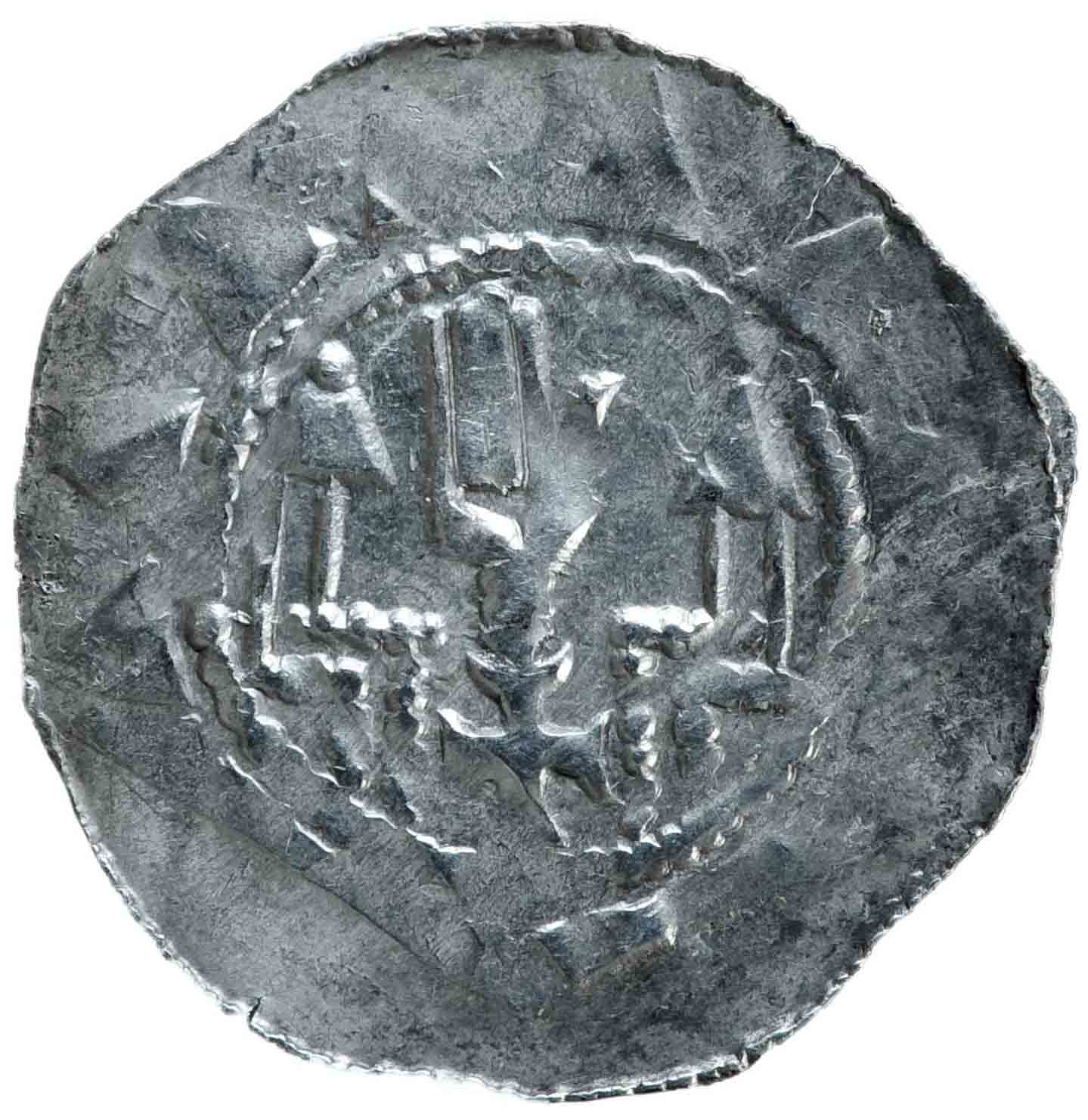 Revers: Die Rückseite entspricht jenem im CNA 1 unter B 32a gezeigtem Stück. Zwischen zwei mit Bögen verzierten Türmen mit Spitzdach und Kugel befindet sich eine aufragende Hand mit nur VIER Fingern. Dies ist auf allen drei erst kürzlich aufgetauchten Belegen der Fall, egal ob sich am Avers eine oder keine Kugel vor dem Kopf befindet. Unter der Hand befindet sich ein Sockel, der einem Eisernen Kreuz ähnlich ist. Linke und rechte nach innen gerichtete Dreieckspitzen berühren sich, die obere und untere kommen dem Zentrum nur sehr nahe.