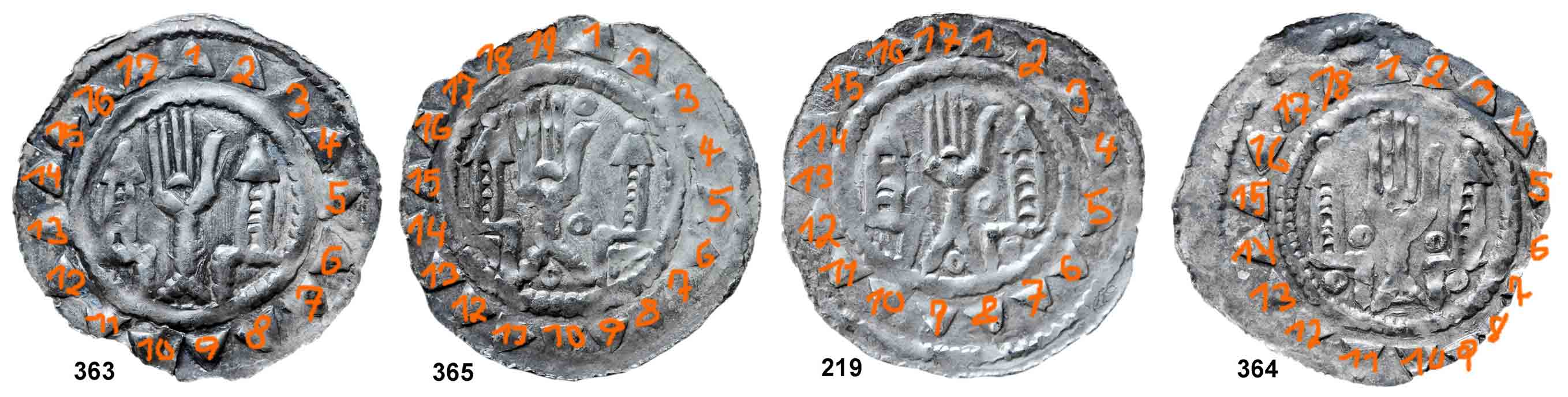 Hierbei dürfte es sich deutlich um Ringel und nicht um Kugeln handeln. Die erste Münze ganz links zeigt keine Beizeichen im Feld. Beim zweiten Pfennig ist die Hand aus der Mitte nach links gerückt und es befinden sich drei Ringel unter bzw. rechts neben der Hand. Der dritte und vierte Pfennig zeigen je 5 Ringel, unter und beidseitig der aufragenden Hand und je ein Ringel im Sockel unter den Türmen. Die beiden rechten Münzen unterscheiden sich durch die Anzahl der Querstriche in den Türmen.