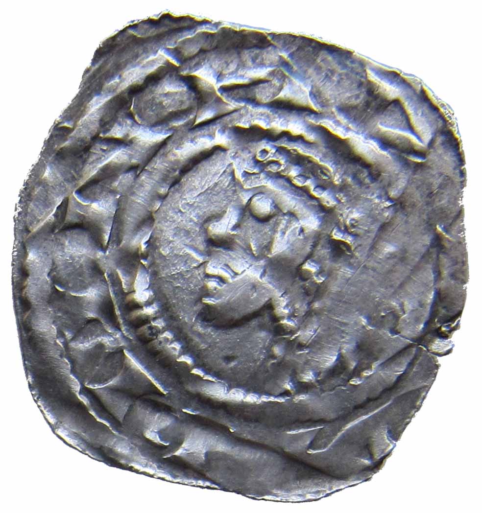Dieser Pfennig unterscheidet sich beidseitig von jenen Belegen, welche hier bereits vorgestellt wurden. Das Haupt am Avers trägt wiederum jene für diesen Münztypus bezeichnende kettengliederartige Kopfbedeckung (Diadem?). Allerdings fehlt bei diesem Stück die eingeringelte Kugel vor dem Kopf. Das Fehlen der Kugel am Avers ist bisher nur bei zwei Stücken des B 32a aufgetreten (auf Seite 8 in diesem Leitfaden).