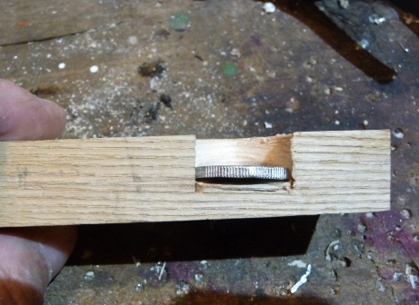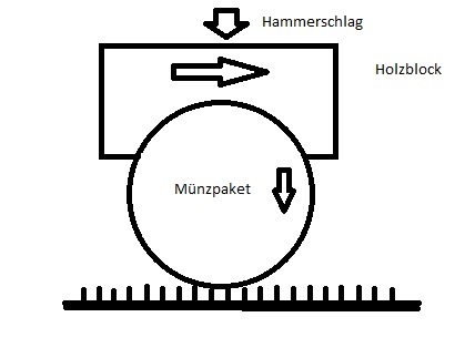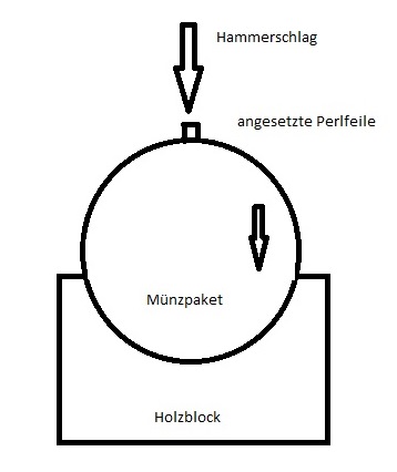 Ich komme lieber noch einmal auf die Perlfeile zurück. Wenn man das Münzüpaket in die Ausnehmung des Holzblocks legt und dann die Perlfeile quer draufsetzt, kann man mit dem Hammer der Reihe nach saubere Schläge setzen und das Paket nach jedem Schlag weiterdrehen.