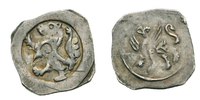 Erst dachte ich an Ottokar II. von Böhmen, wobei die Münze evtl. sekundär als Knopf verwendet wurde, aber der Löwe (Hund/Leopard?) paßt nicht zu CNA Cc13.