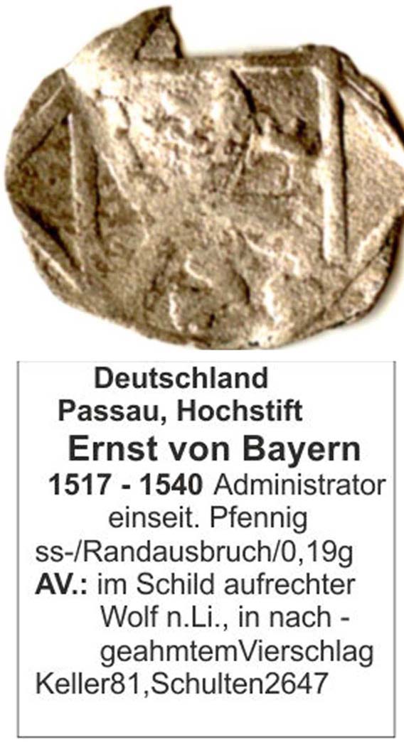 ich darf mich noch einmal mit einem Nachtrag zu deinem Pfennig melden. Ich habe geschrieben, dass es sich "vermutlich" um einen Pfennig von Ernst von Bayern handelt, weil Schulten auch schon für seinen Vorgänger Wigileus Fröschl von Marzoli (1500 - 1517) mehrere Pfennig mit dem Wolfswappen anführt (Nr. 2635, 2636, 2637). Die Nr. 2636 ist auch abgebildet und hat oben ein "W"; 2635 hat auf der Rückseite ein "W" und 3637 oben ein "B". In dieser Zeit dürfte auch ein Wandel in der Münzprägung stattgefunden haben. Die echten Vierschlagpfennige (quadratischer Schrötling, der durch 4 Hammerschläge gerundet wurde) verschwanden; offensichtlich haben im 16. Jahrhundert neue und bessere Prägetechniken die materialsparende aber aufwändige Herstellung der Vierschlagsschrötlinge abgelöst. Die Erinnerung an die "guten, alten" Vierschlagpfennige wurde aber wach gehalten indem man auf die Münzen zusätzlich zur Bilddarstellung (Wappen) eine Raute prägte, die ihr den Charakter eines Vierschlages verlieh. Dieser Pseudovierschlag oder nachgemachte Vierschlag war bei den Pfennigen des 16. Jahrhunderts sehr häufig. Schulten gibt bei seinem Pfennig 2635 einen Vierschlag an (leider gibt es da keine Abbildung), bei den folgenden Pfennigen schreibt er aber bereits "nachgemachter Vierschlag" (2636 ist abgebildet). Der Pfennig von Ernst v. Bayern hat die Nummer 2647 (auch abgebildet) und hat ebenfalls einen nachgemachten Vierschlag. Die Umstellung dürfte demnach also um 1510 stattgefunden haben. Ich habe auch dazu einige Beispiele aus meiner Sammlung. Der Pfennig von Otto v. Lohnsdorf (1200- 1265) zeigt den Passauer Wolf mit echtem Vierschlag; die Pfennige von Lang v. Wellenburg (Salzburg) und Ferdinand I. (Linz) weisen nachgemachte Vierschläge (Rauten) auf.