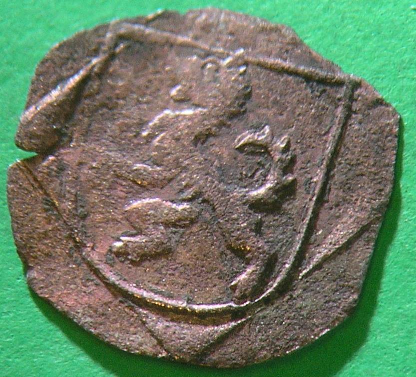 Die erste Münze, 0,24g schwer, ca. 11mm Durchmesser, Silber, einseitig Löwei in Wappen