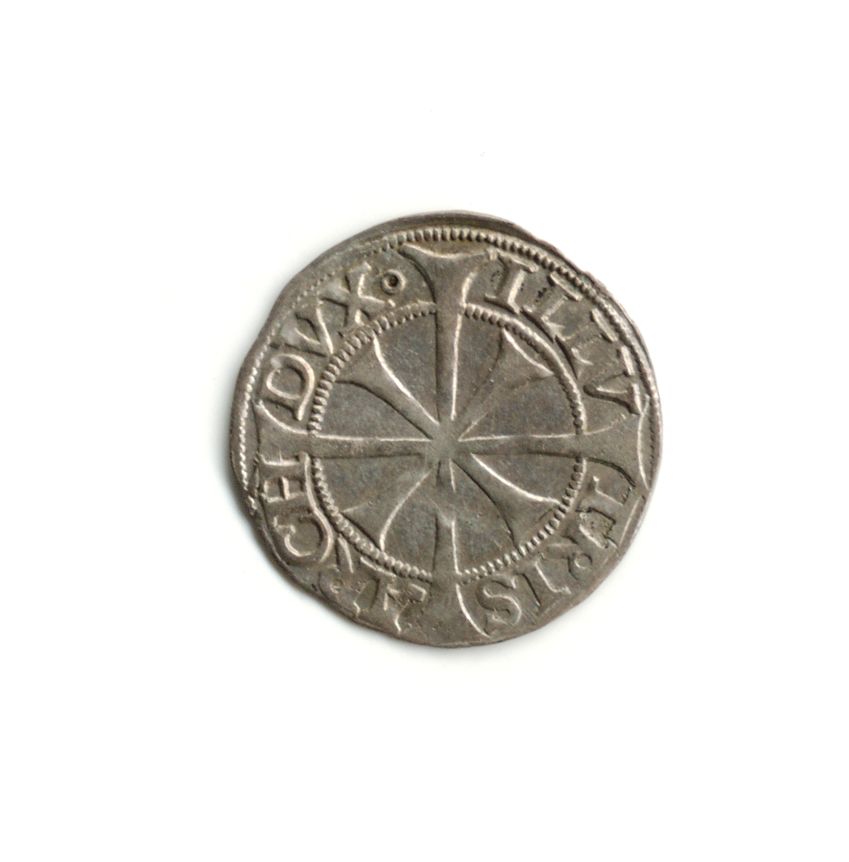 Am Revers befindet sich ein Bindenschild im Perlkreis mit der Umschrift ARCHID V(C). . Vielleicht aber auch ARCH (Beizeichen) DVC.?