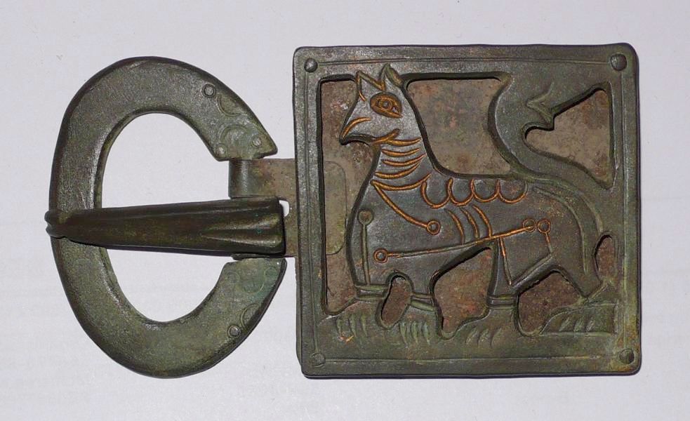 diese Schnalle stammt meines Erachtens – wenn sie echt ist - aus der späten Völkerwanderungszeit und ist germanisch. Das Motiv leitet sich tatsächlich vom Greif her, der schon seit dem 3. Jahrtausend v. C. ausgehend von Mesopotamien in vielen Kulturen vorwiegend als apotrophäisches (Unheil-abwendendes) Symbol verwendet wurde. Über die Skythen breitete sich dar Greif bis nach China, ja sogar auf die koreanische Halbinsel und nach Japan aus. Von den nach Westen vordringenden Steppenvölkern waren es vor allem die Avaren, die das Motiv häufig verwendeten. Bei den Franken, Alamannen und Burgundern taucht das Motiv ab 550 auf. Verschiedene Theorien legen die Herkunft zu den Römern, in den Kaukasus, in den Orient und zu den Avaren. Sie sind aber alle nicht stichhältig. Kühn legt daher die Herkunft nach Byzanz, wo es über Oberitalien oder Marseille Eingang in die germanische Kultur vor allem der Burgunder fand. Der Hauptteil der Funde beschränkt sich daher auf dieses Gebiet (Westschweiz, östliches und nördliches Frankreich), in wenigen Exemplaren nördlich und südlich der Pyrenäen. Dass der byzantinische Einfluss auf die Völker des Nordens relativ groß war, belegen ja auch die zahlreichen Nachprägungen von Münzen, vor allem goldene Solidi, die oft mit Billigung des Kaisers in „Lizenz“ hergestellt wurden. Das Greifenmotiv hat in dieser Zeit eine Wandlung mitgemacht. Der bei den Germanen ursprünglich nicht bekannte Greif entwickelte sich zum Flügelpferd, und die Flügel wurden später zum Reiter oder fielen ganz weg. Einzig der Greifenschnabel und die Krallen haben sich lange gehalten. Und damit sind wir bei dieser Darstellung, die daher als relativ spät einzustufen ist.