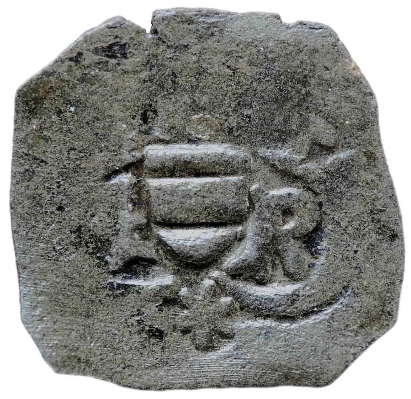Im Zentrum der Bindenschild im Dreipaß, oben Prägeschwäche ("F."???), rechts ein "R", gegenüber ein "I". Im unteren äußeren Dreipaßwinkel ein sechsstrahliger Stern, rechts oben 5 (?, vielleicht für 1455/1465). Im linken äußeren Dreipaßwinkel ist aufgrund der Prägeschwäche leider nichts erkennbar.