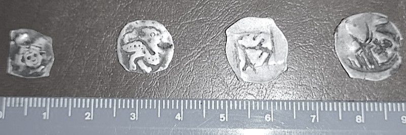 da zeigt die Feinwaage 0,60g an. Beim Gesamtbild ganz rechts könnte ein Mönchspfennig sein?