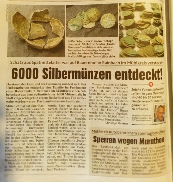 Im Mühlviertel (O.Ö.) wurde vor Kurzem bei Umbauarbeiten ein spätmittelalterlicher Münzschatz entdeckt.