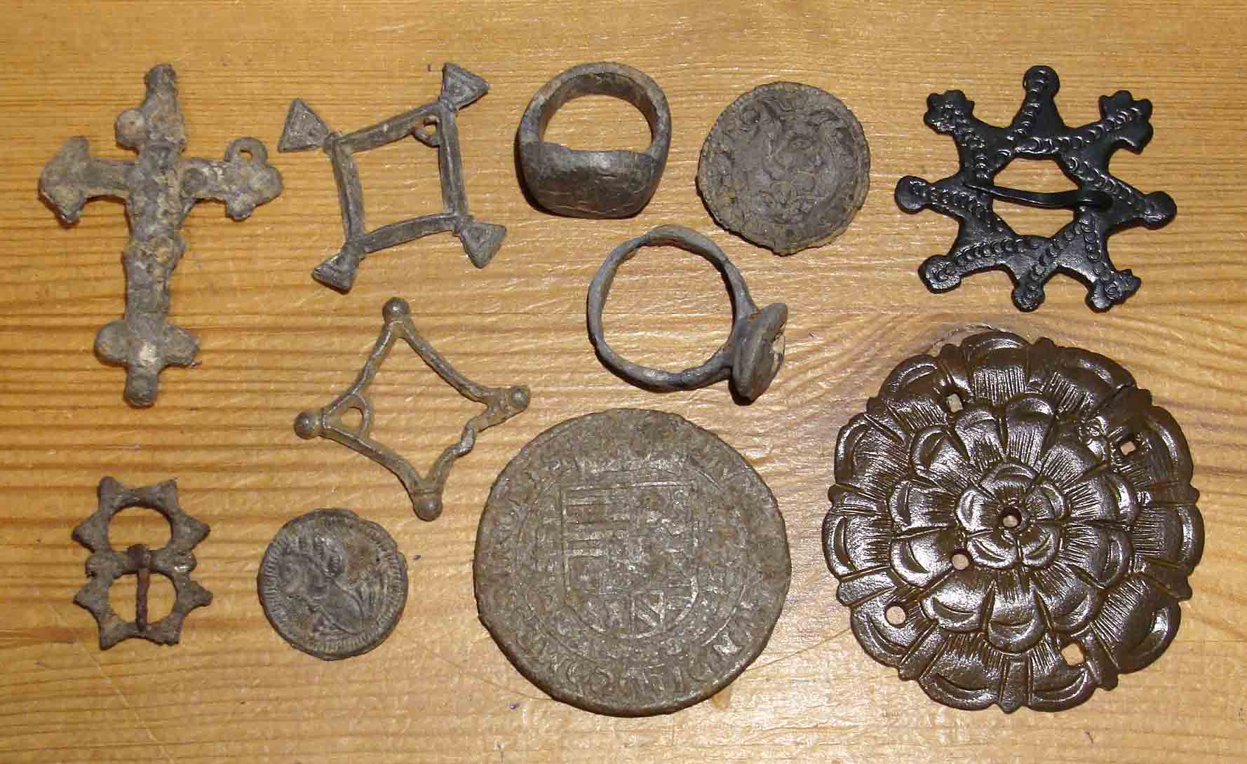 Das Material, seine genaue Zusammensetzung noch nicht untersucht, wurde aber in ähnlicher Zusammensetzung im Spätmittelalter und in der frühen Neuzeit (15. bis weit ins 16. Jahrhundert) auch für andere Dinge, wie Kreuze, Fürspane, Doppelknöpfe, Knöpfe, Beschläge, Schnallen und selten auch für Siegelringe verwendet. Da Gegenstände aus dieser Materialzusammensetzung aber zumeist nicht sehr schön sind, werden sie nicht gehandelt und zumeist von den Findern entsorgt. Somit sind sie für Sammler, die nicht selber suchen, zumeist auch nicht bekannt. Habe dir ein Bild von einigen erwähnten Sachen beigefügt. Zum Materialvergleich rechts unten ein Zierbeschlag aus Kupfer und darüber ein schöner Fürspan aus Bronze.