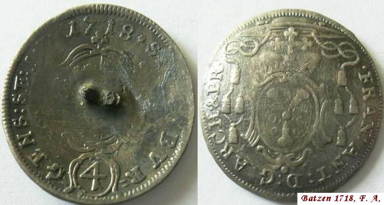 Wenn das einmal eine echte Münze war, wäre es ein 2- Kreuzerstück von Johann Ernst v. Thun Hohenstein, Probszt Nr. 1862. Auf der Rückseite müsste dann SALZB. LAND-MINZ und die Jahreszahl erkennbar sein. Die Halbbatzen von Guidobald haben nur ein Wappen (Vorderseite Salzburger W., Rückseite Familienwappen). Alle Halbbatzen zu dieser Zeit waren aus Silber. Wenn Deine Münze aus Messing ist, könnte sie vielleicht extra als Knopf fabriziert worden sein. Solche Imitationen gibt es heute noch, vielleicht hat jemand so etwas schon früher probiert.