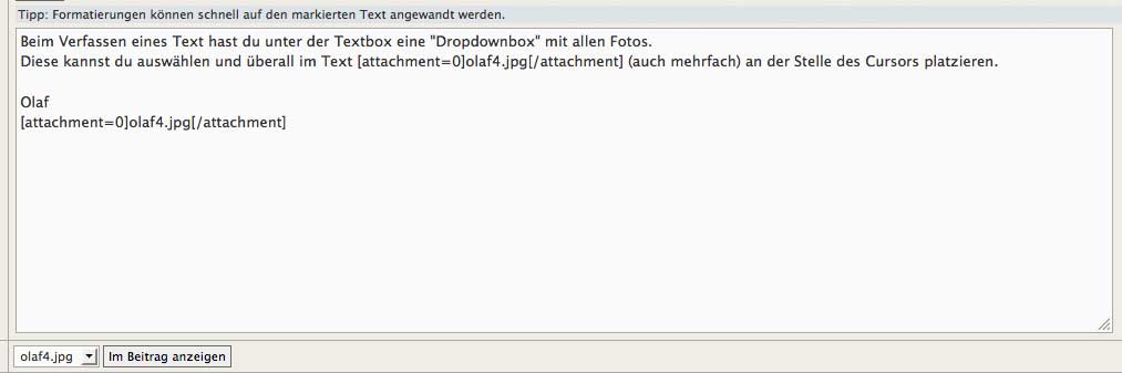 Beim Verfassen eines Text hast du unter der Textbox eine "Dropdownbox" mit allen Fotos.