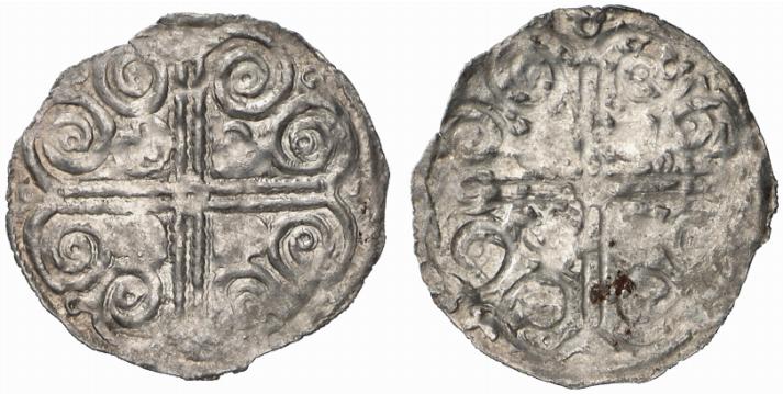 d=26 mm Dietrich, 1127 - 1140 (?). Dünnpfennig, Neunkirchen. Stilisiertes Doppelfadenkreuz. Rs: Darstellung im Binnenkreis unkenntlich, außen Hufeisenrand. CNA nicht. 0,75g. äußerst selten. Sehr schön. Die Vorderseite ähnelt den Koch bekannten kupfrigen zeitgenössischen Fälschungen (CNA Tafel 14, B-A bis B-C).
