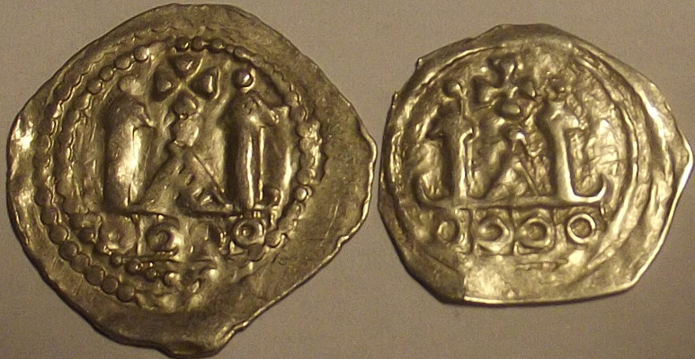 beide sind ERIACENSIS-Pfennige, der "kleinere" wurde am Rand beschnitten, darum ist er leichter und kleiner.