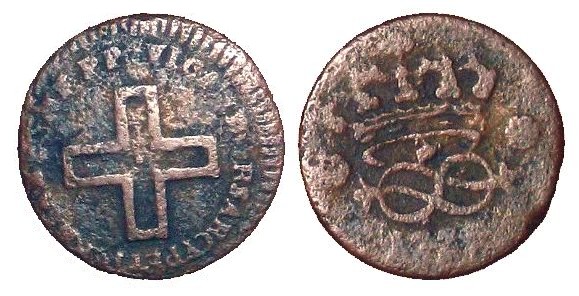 Dieser "Liebesknoten" (nodo d’amore) ist ein Synonym für den "Savoyardenknoten" (nodo savoia), und als solcher findet er sich auch auf Münzen aus Savoyen. Mein Beispiel zeigt einen nicht genau bestimmten Quattrino (?), geprägt unter Vittorio Amadeo II. (1675-1720).