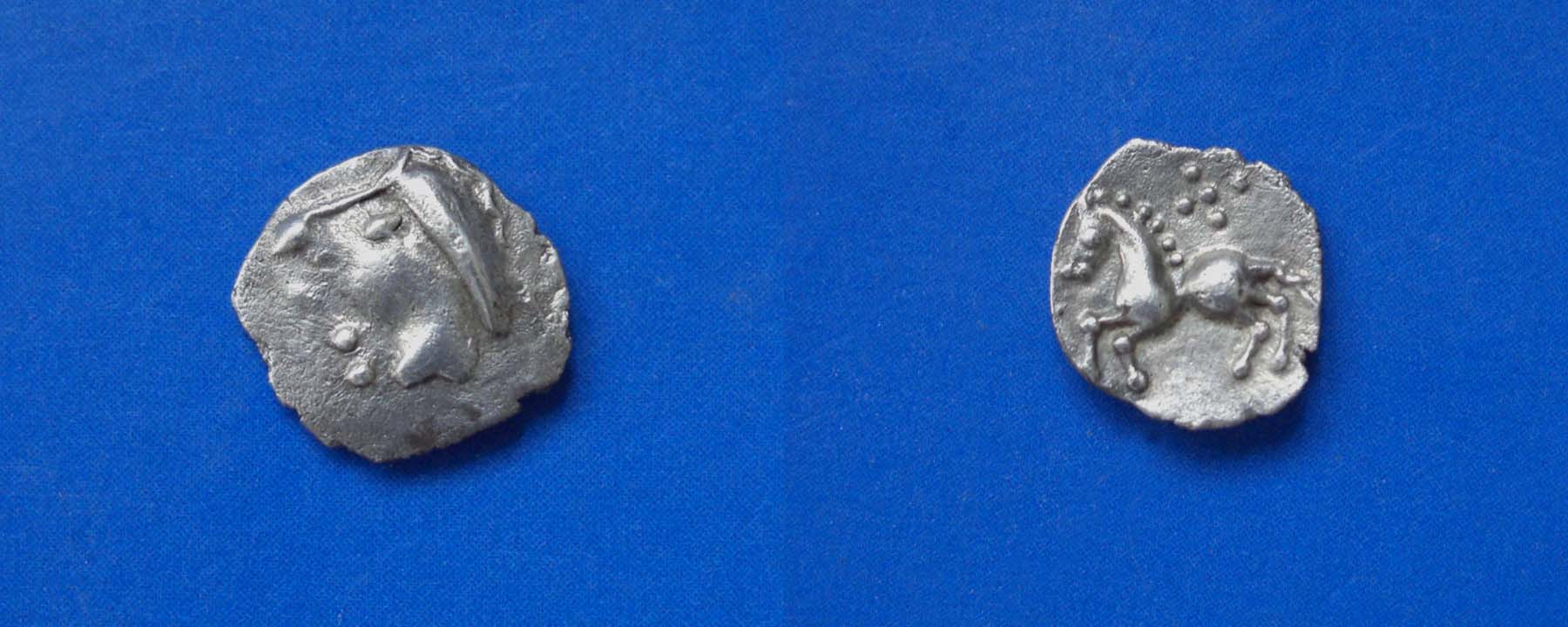Der Avers zeigt einen in unterschiedliche Stadien aufgelösten Kopf mit dem für keltische Stammesoberhäupter üblichen Halsreifen.