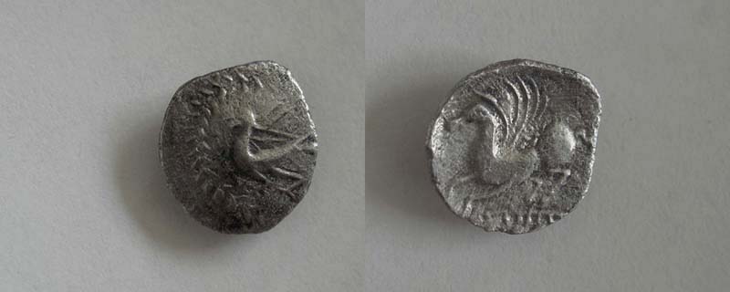 Av: Nach links laufender Wasservogel im Winkelkranz Rv: Pegasus mit langer Schnauze galoppiert nach links. Darunter Reste einer Legende oder Scheinlegende.