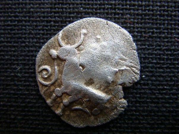 Die Unterlage ist offenbar ein Manchinger Kleinsilber, wobei im Avers neben dem Kopf auch klar ein Pferd nach links erkennbar ist.