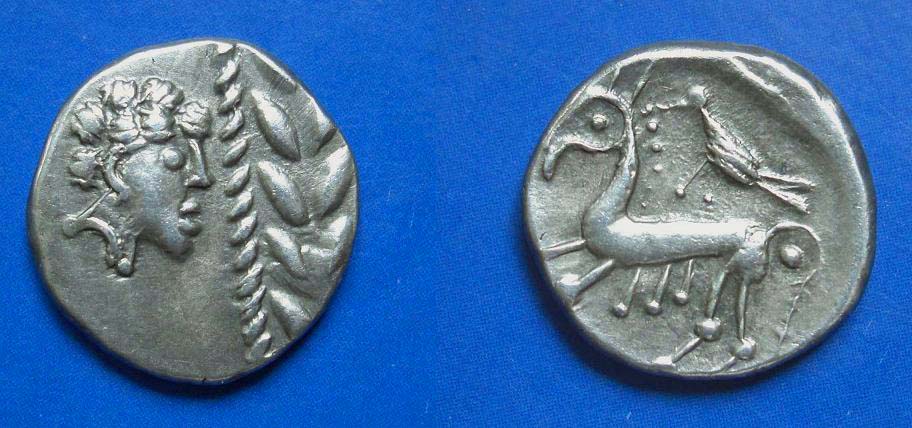 Der Typ Totfalu kommt vernehmlich im Osten von Transdanubien vor. Diese Münze hat den wahrscheinlich den am besten erhaltenen Avers unter diesem mäßig häufigen Typ. Eine ähnliche Reversdarstellung, jedoch ohne den Vogel, kommt auch bei den Hexadrachmen der Boier in Bratislava vor. (Anonymer Typ, Göbl Taf. 6, XVIII)