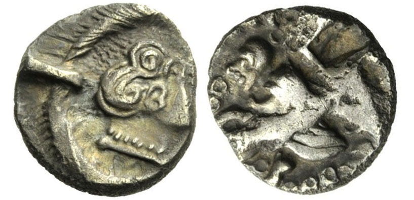 Vs: Lockenkopf mit Lippenpunkten nach rechts, darum Torques