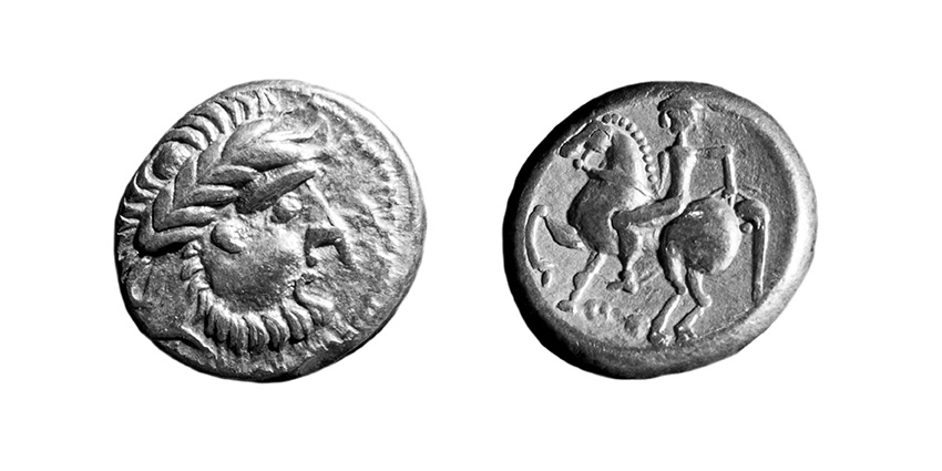 Vor einiger Zeit ist mir eine Tetradrachme zugeflogen, die als eine Art Missing Link zwischen dem Dachreiter-Typ und dem Pegasos-Typ angesehen werden kann. Die Entwicklung der skordiskischen Typen hat unser Keltenspezialist Harald bereits wunderschön hier dokumentiert: viewtopic.php?f=44&t=5153&hilit=kugelwange