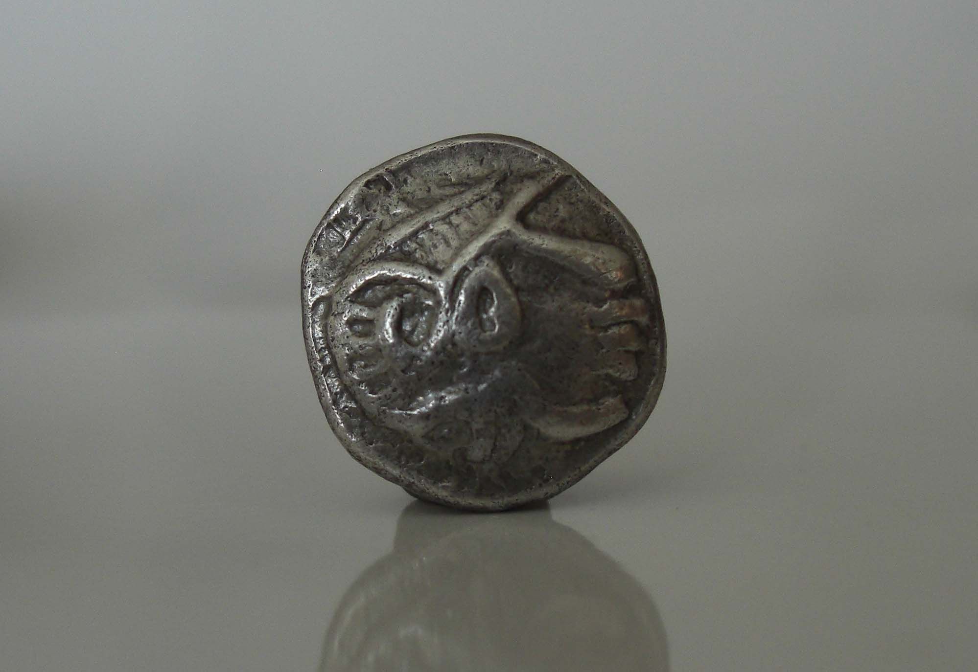 Der Avers zeigt eindeutig einen stark stilisierten behelmten Athenakopf nach rechts.