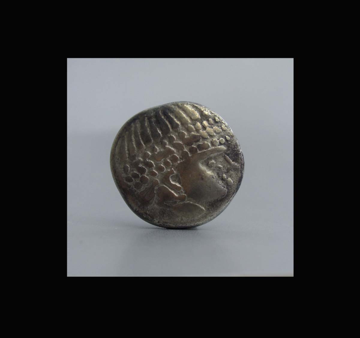 Av: Bartloser Männerkopf r. mit dreifachem Perldiadem, breitem Stirnwulst, zu Strähnen geornetem Haar mit Schopf, Hakennase, Doppelpunktmund, Kugelauge mit Kugel darunter und geschwungenem Halsabschnitt. (siehe OTA 477)