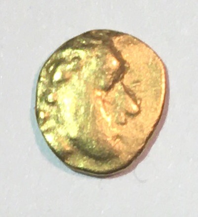1/24 Stater Typ Janus 1 geschüsselter Schrötling D: 7mm, 6,9mm G: 0,34g, 0,29g Datierung: 220-190v.Chr. Das rechte Exemplar ist nicht nur leichter, es ist auch aus einer stärker legierten Goldlegierung geprägt. Vergleicht man beide Stempelvarianten ist zu vermuten, dass die Stempel der rechten Münze die jüngeren sind.