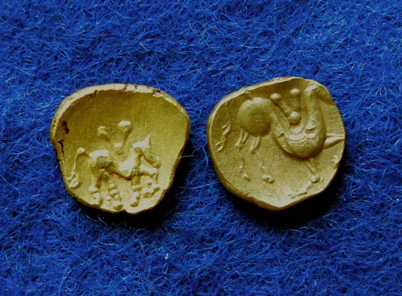 Zitat Schatzfund: L. Wamser, Ein Schatzfund keltischer Goldmünzen aus dem Hofoldinger Forst, Gold, Magie Mythos Macht, Katalog zur Auustellung der Archäologischen Staatssammlung München, 2002, S 100- 128. Diese beiden Münzen sind abgebildet auf den Tafeln 75 und 76, 1 Reihe 1. Stück von links, 3. Reihe 2. Stück von links.