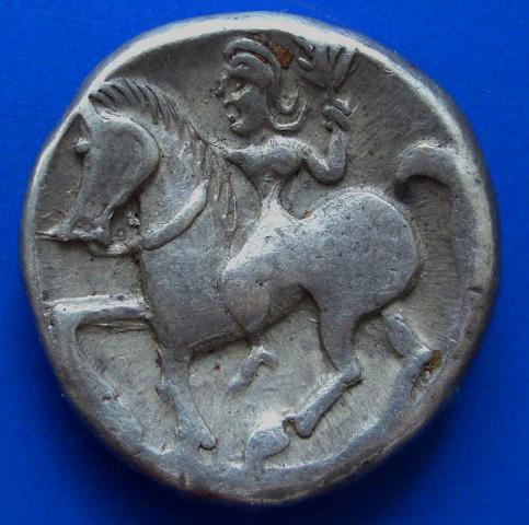 Die Aversdarstellung dieser Prägungen hat ihren Ursprung bei den Goldprägungen des Lysimachos. Die frühen ostkeltischen Imitationen und Vorgänger der hier vorgestellten Variante zeigen noch deutlich das Ammonshorn.