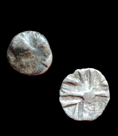 Bei der oberen der beiden vorgestellten Münzen handelt es sich um ein westnorisches Kleinsilber (sog. Obol), Typ "Eis", das Revers zeigt ein Winkelkreuz. Eine der bekannten Münzstätten dieses Typs befand sich am Magdalensberg, Bezirk St. Veit/Glan, daher in den Publikationen auch als Typ "Magdalensberg" bekannt. Zur genaueren Bestimmung müsste man das Avers vergleichen. Datierung: 2.-1. Jhdt. v. Chr.