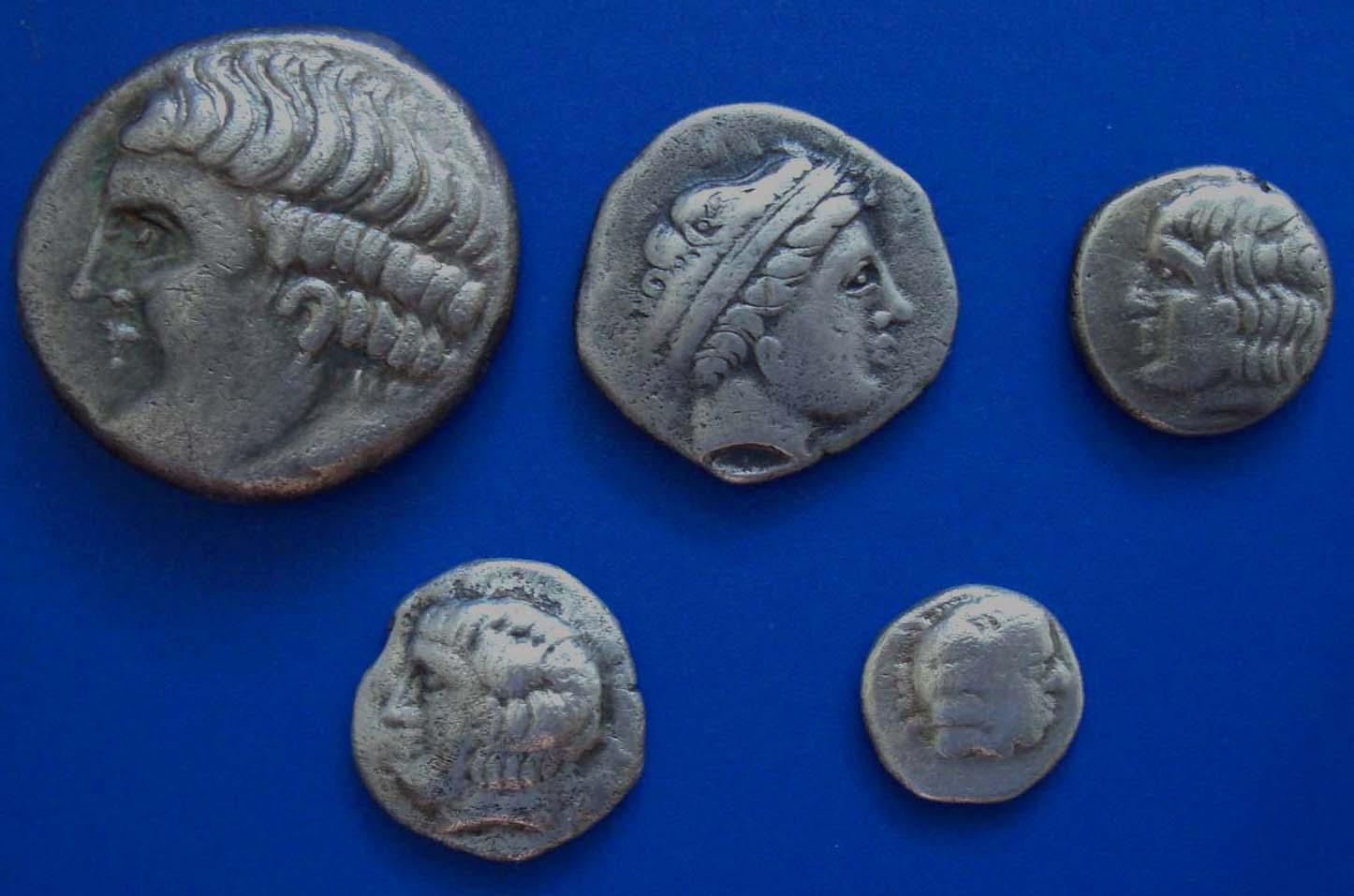 Es handelt sich um eine Tetradrachme, eine Drachme, Hemidrachmen und einen Obol.